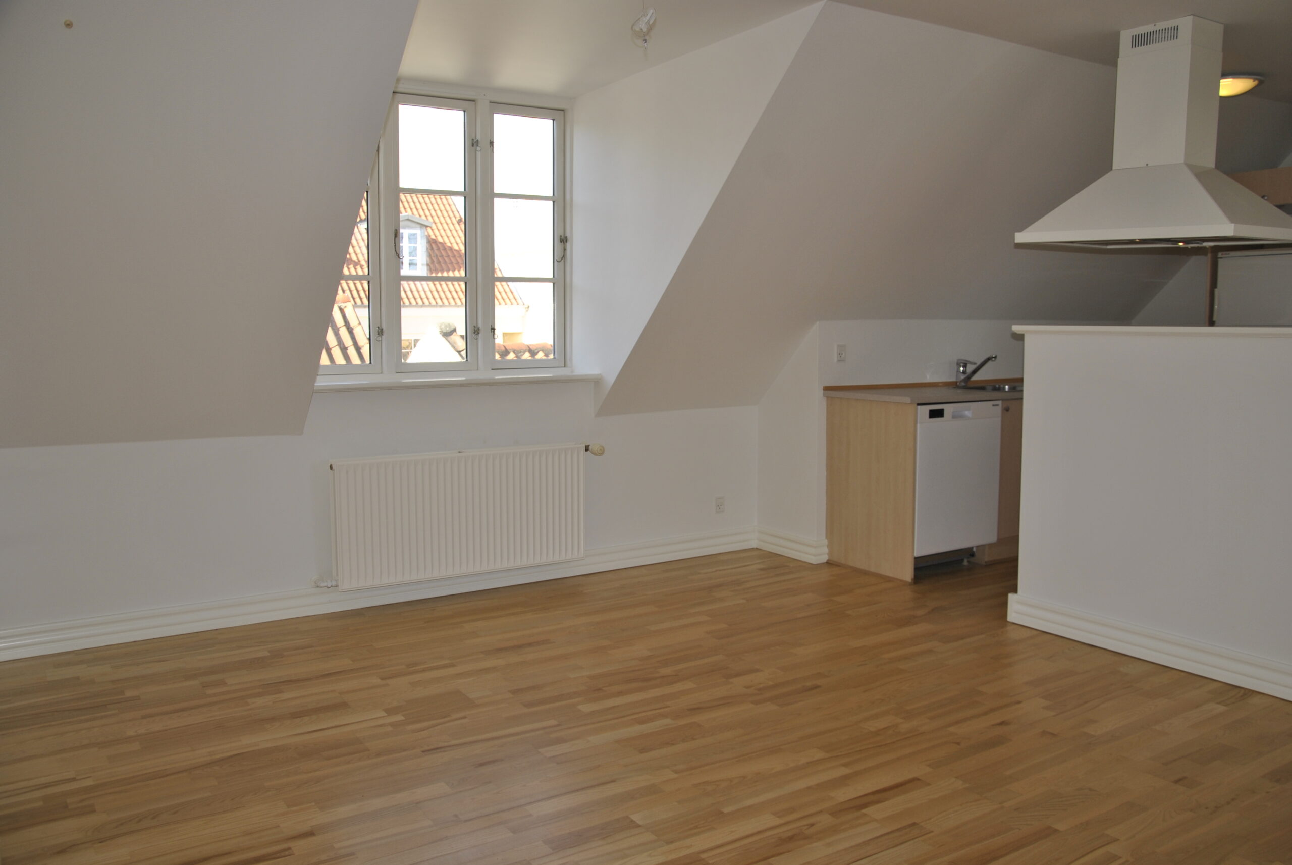 Der er flotte trægulve i stue og køkken.